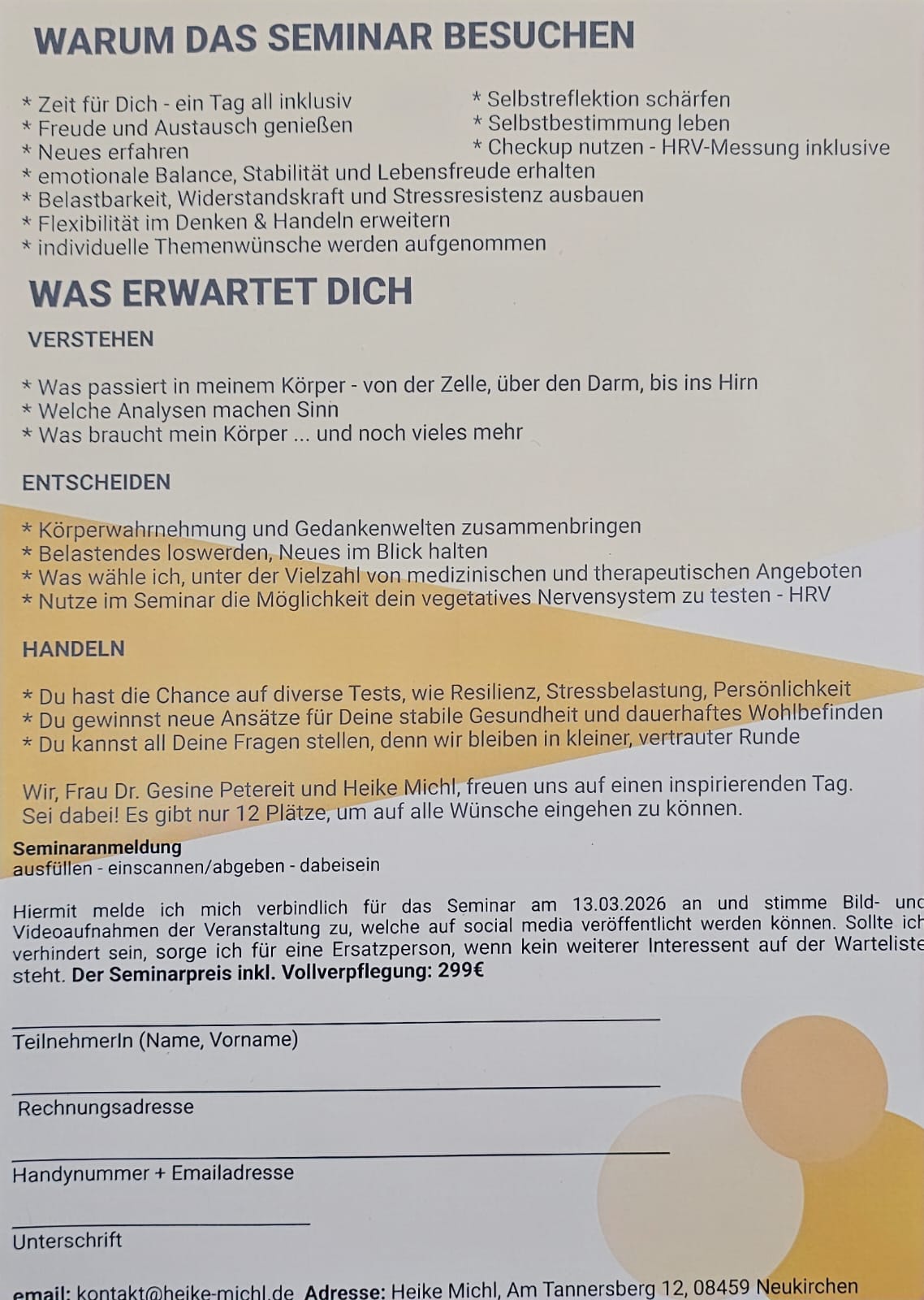 Am 13.03.2026 erwartet dich in Neukirchen/Pleiße ein intensives Tagesseminar mit Dr. med. Gesine Petereit und Heike Michl. Im Fokus stehen die Zusammenhänge von Stress, Long-COVID, Wechseljahren und Darmgesundheit – verständlich erklärt von der Zelle bis ins Gehirn. Du lernst, Körpersignale besser zu deuten, sinnvolle Analysen zu erkennen und fundierte Entscheidungen für deine Gesundheit zu treffen.