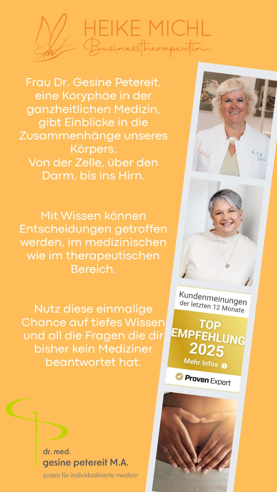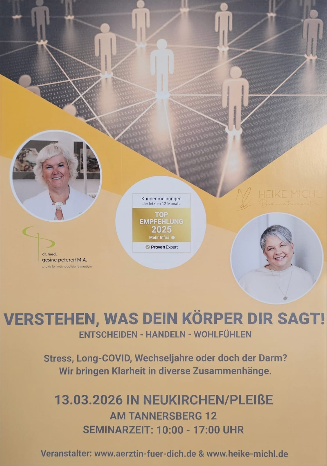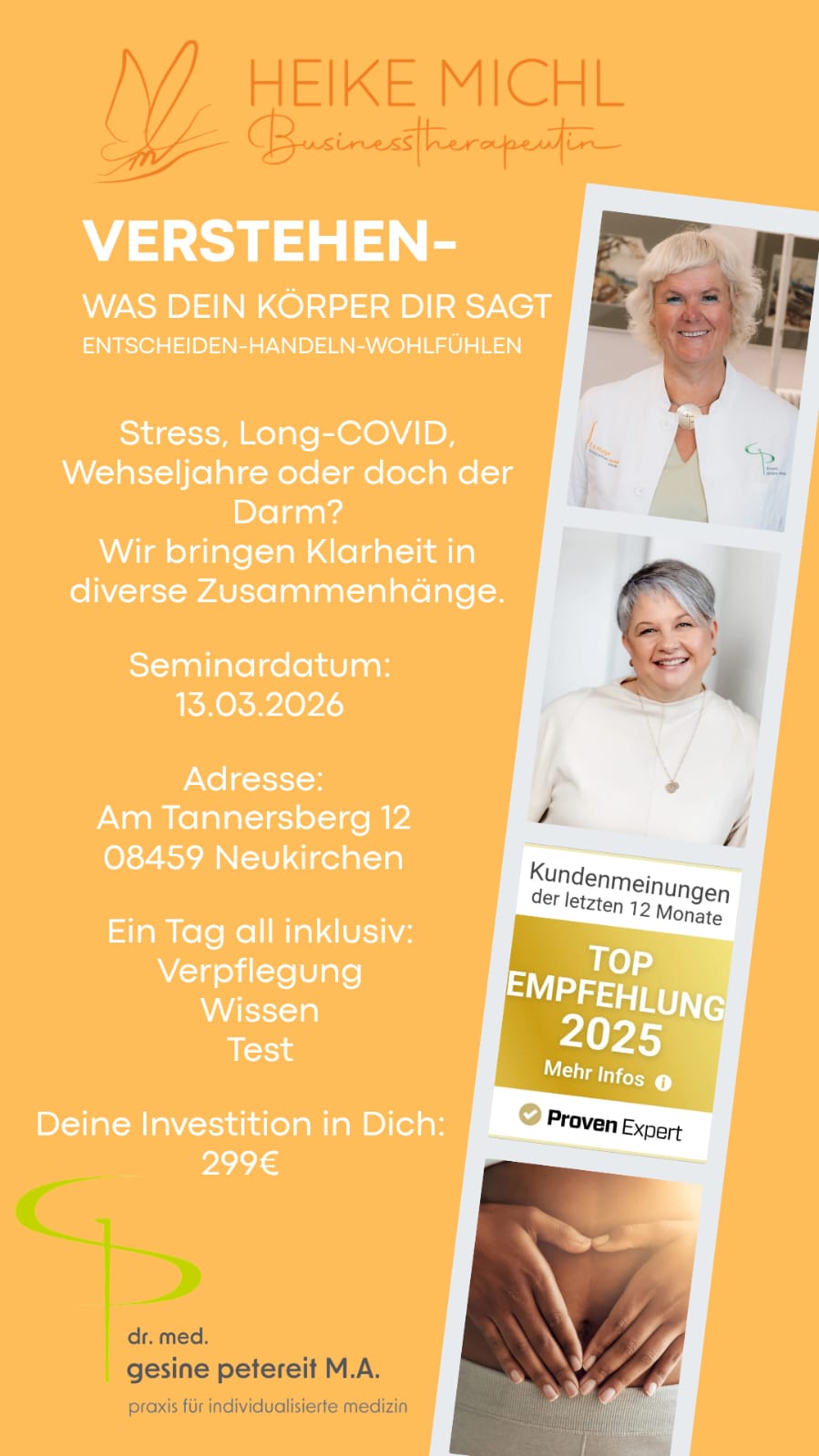 Am 13.03.2026 erwartet dich in Neukirchen/Pleiße ein intensives Tagesseminar mit Dr. med. Gesine Petereit und Heike Michl. Im Fokus stehen die Zusammenhänge von Stress, Long-COVID, Wechseljahren und Darmgesundheit – verständlich erklärt von der Zelle bis ins Gehirn. Du lernst, Körpersignale besser zu deuten, sinnvolle Analysen zu erkennen und fundierte Entscheidungen für deine Gesundheit zu treffen.